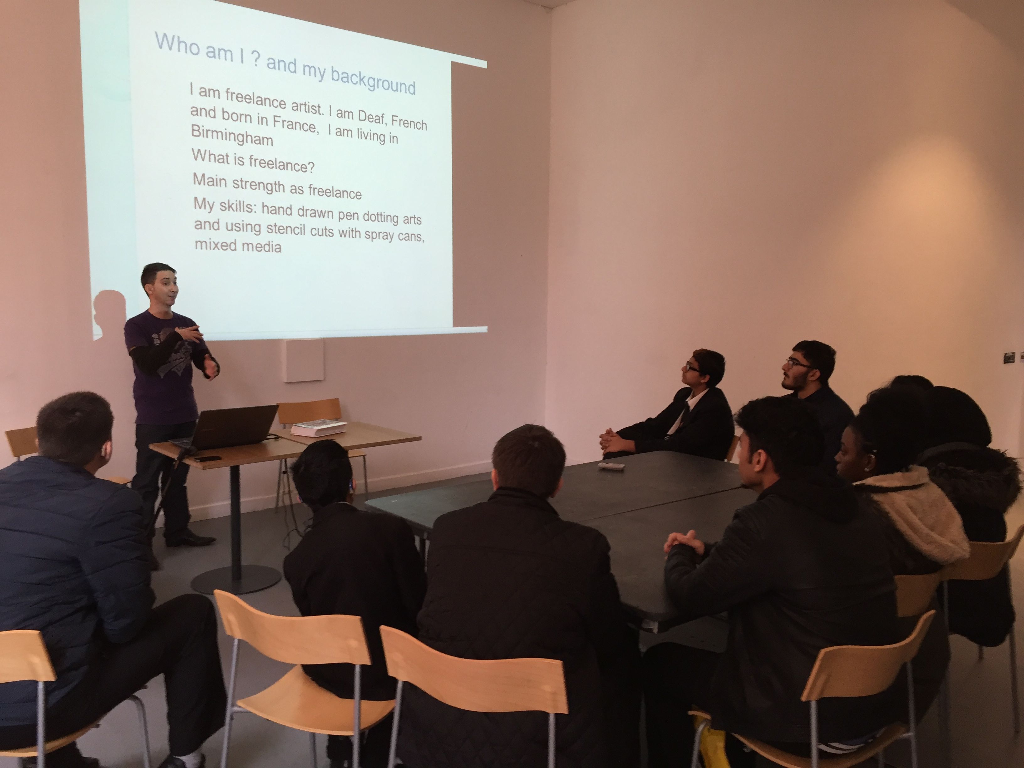 This deaf explorer event was also a learning experience for the artists, who had been mentored like other artists over the weekend by Rubbena Aurangzeb- Tariq to improve their presentation skills, understand how to respond to a brief, and gain confidence about talking to groups and running workshops. When I arrived the artists were talking about the purpose of their presentations and how they wanted the children to feel comfortable asking questions. Deaf Poet Donna Williams kicked off welcoming the pupils to the Gallery, and asking each person their name and asking who is their favourite artist and why, this was a great ice breaker, and enabled the pupils to describe their interest and study of art, that they continued with through out the morning. Next up in front of the school pupils was Olivier Jamon, who described the detail of how he made a living as an artist, selling art work on his website and the importance of having ideas for where to show and promote your art work. Olivier showed the hidden side to an artist and told the group about nurturing networks to support him to deliver artistic projects, like his hand drawn art work and stencil graffiti at Grand Central ( the new train station in Birmingham)