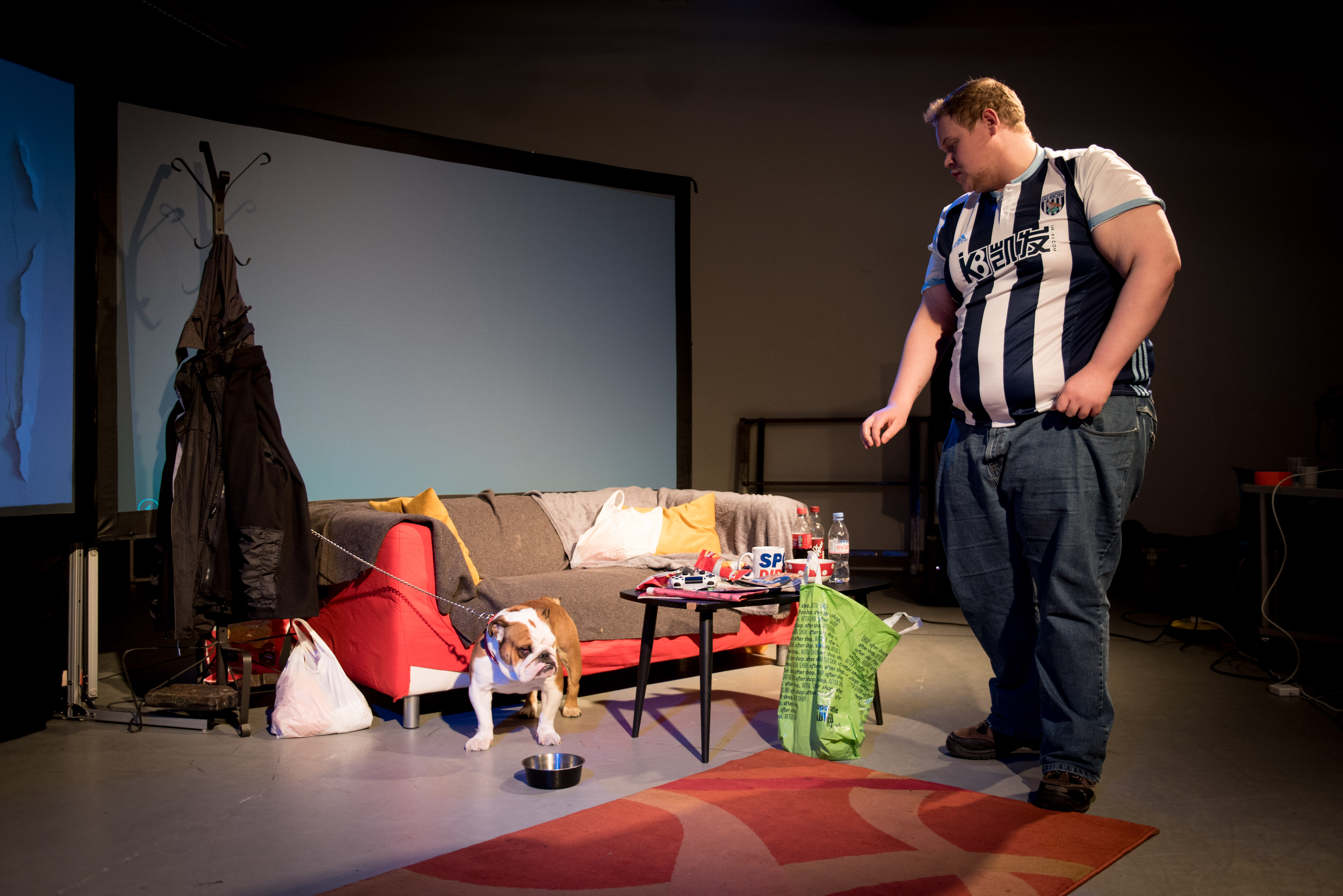 The man in the West Bromwich Albion shirt gestures with his hands the subtitles say “What do I do with the dog”