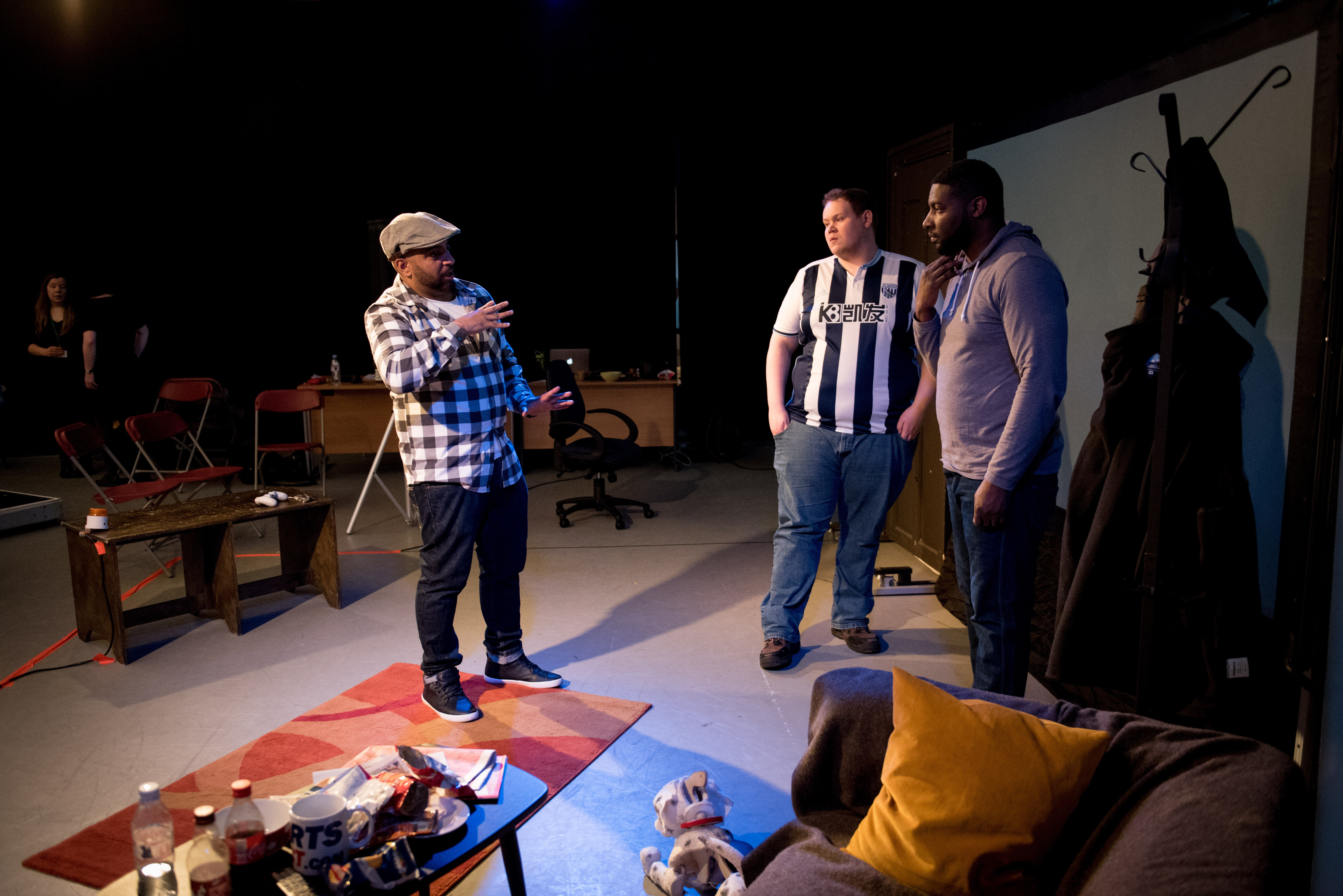 There are three men in this picture, On the left hand side Rinkoo is directing using hand movement that has purpose and two men are looking at Rinkoo’s hands and face with interest. In the middle is a young man who is overweight and sporting a West Bromwich Albion football shirt. The man on the right is wearing a hoody