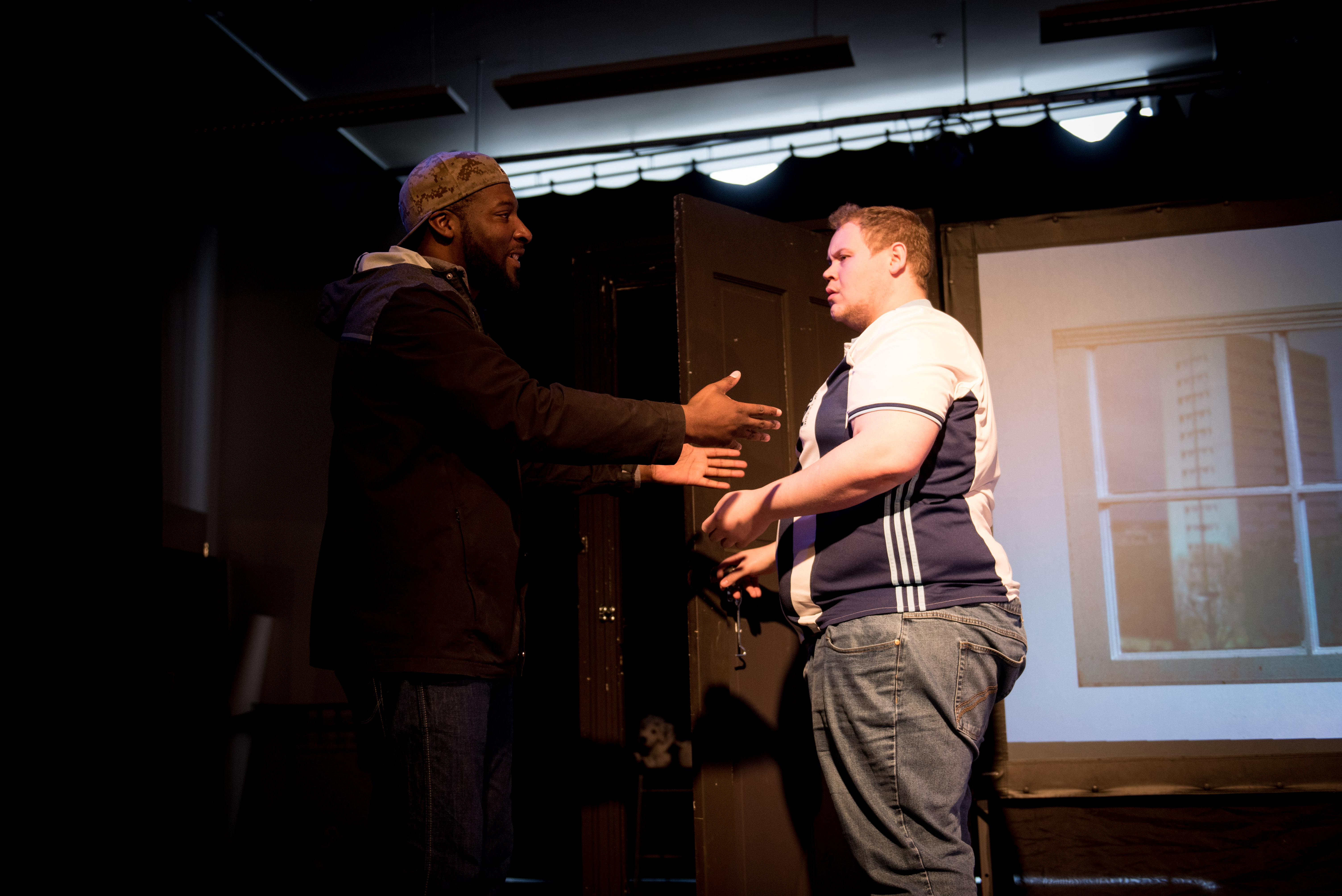 A man has entered the flat, the character is Troy. The man has a cap on his head. The peak of the cap is on the back of his head. The man gestures with his hands. He is communicating the character of Troy and uses urban sign language.