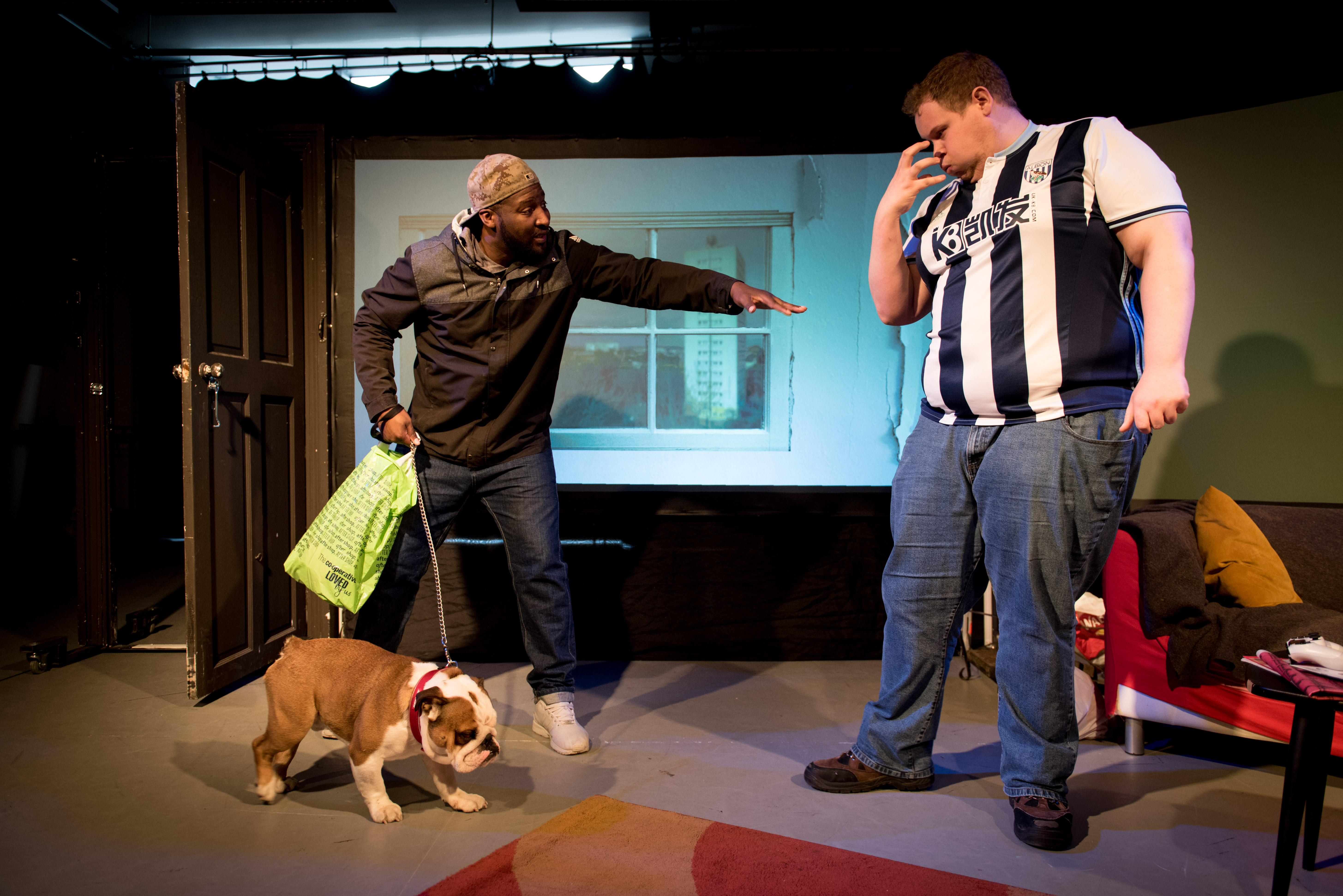 The man in the West Bromwich Albion shirt gestures with his hands putting a claw like muzzle to his face. Troy is trying to convince Bubble to take the dog.