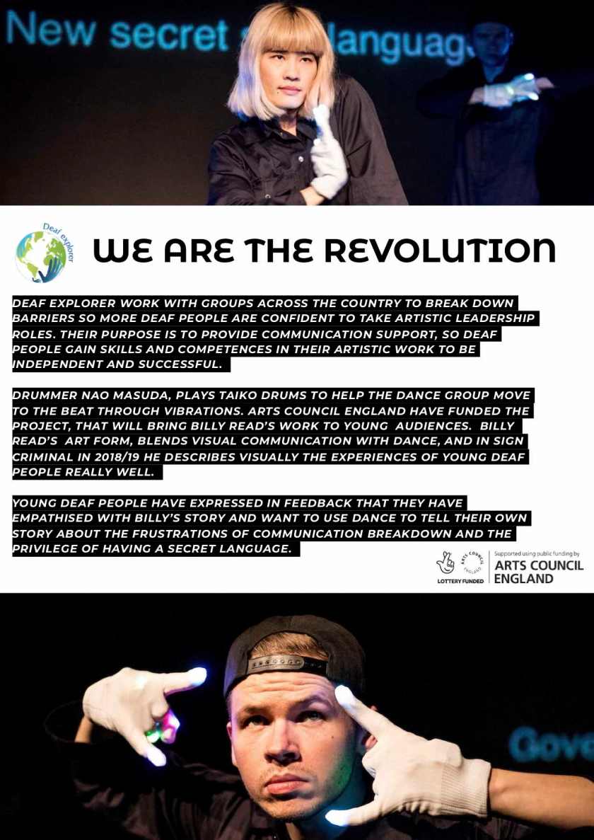 That will be followed by a totally unique performance by Deaf Explorer dance artist Billy Read of “We are the Revolution” based on a series of workshops, in collaboration with Deborah Pugh, a Movement artist.