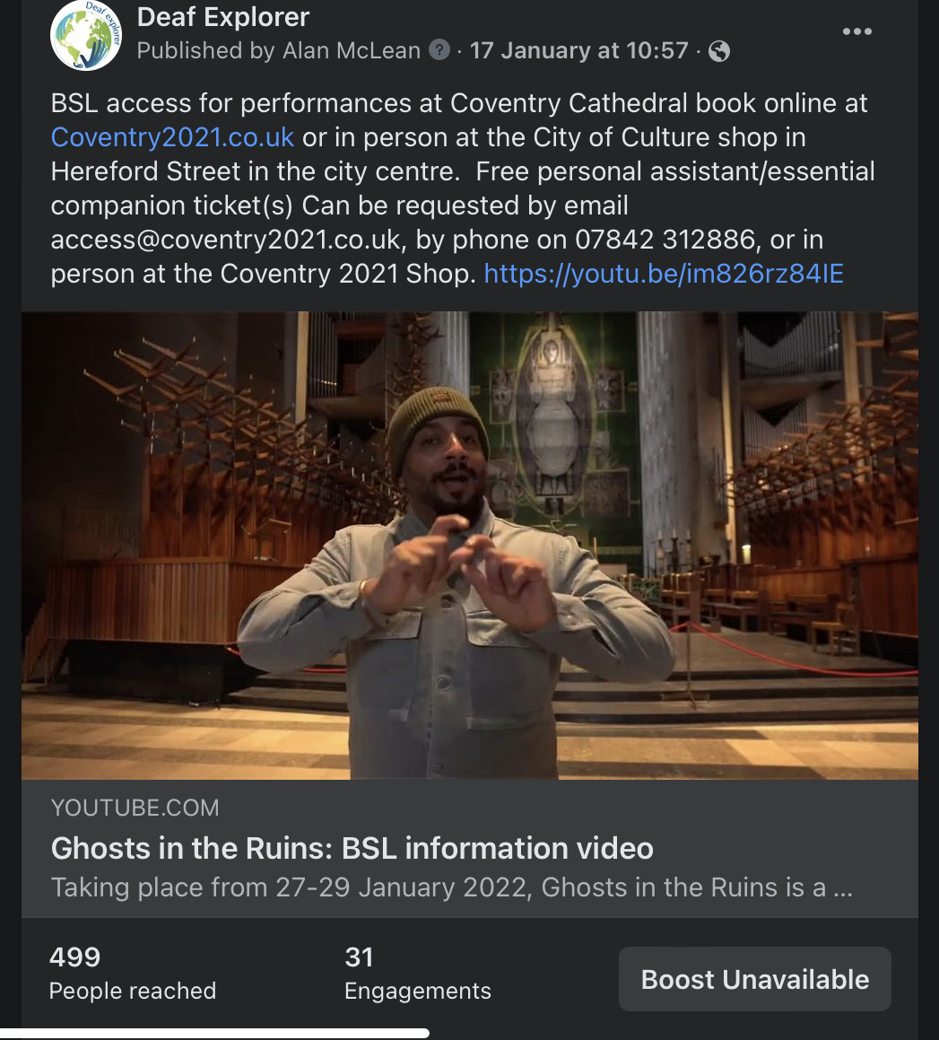 Laura has continued to ask Deaf Explorer to promoto events and activities. BSL video’s by Deaf People are posted on facebook get the message out about the unique events for Coventry City of Culture 2021. Avergage engagement on facebook for just over 30 people and just under 500 people reached.