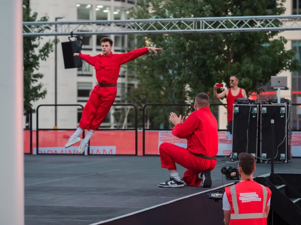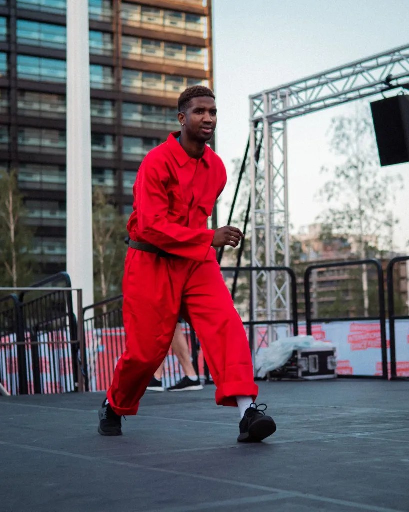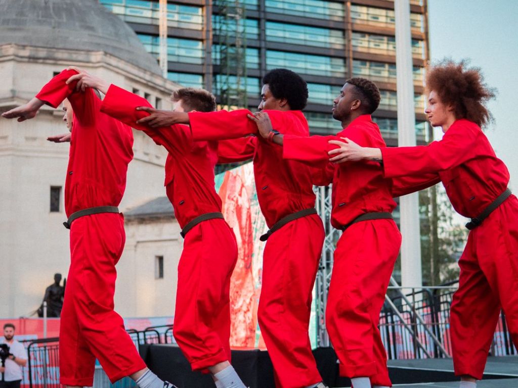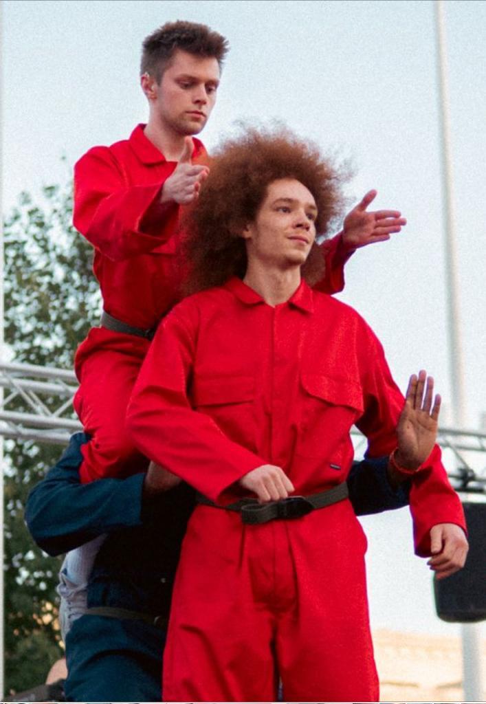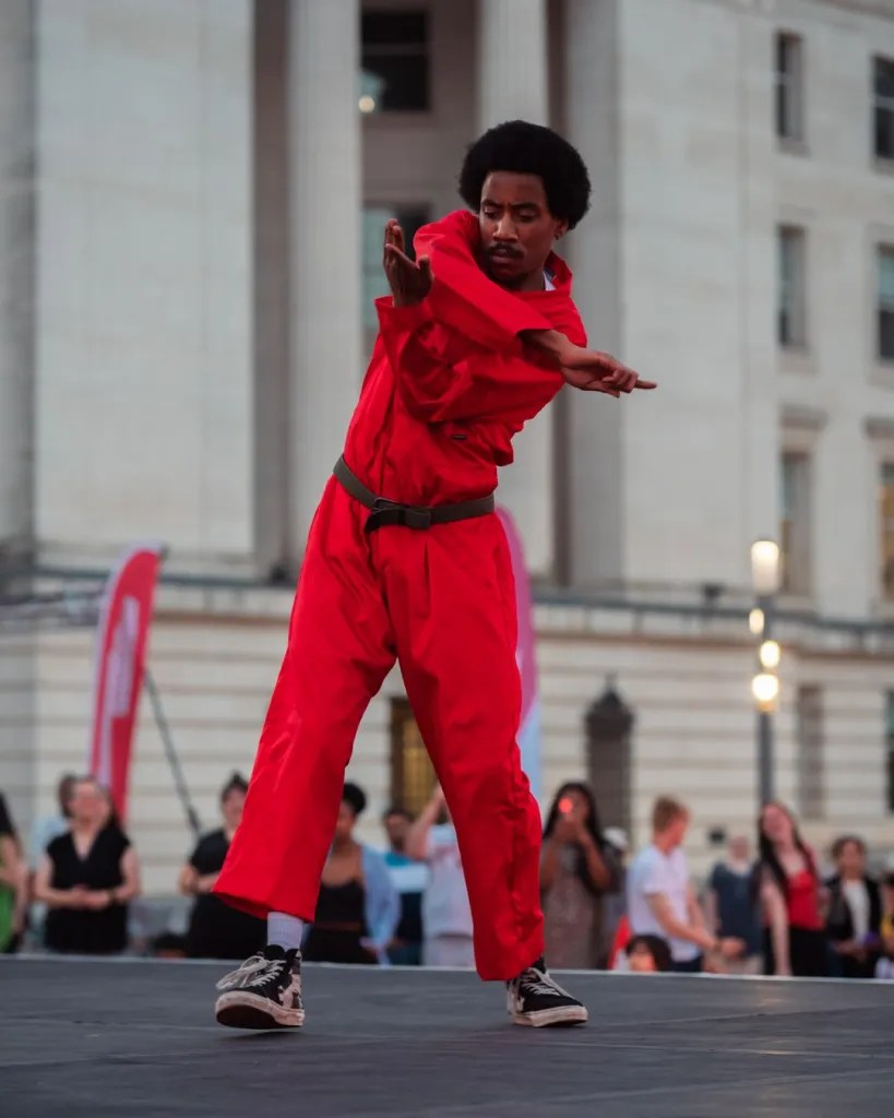 Dance moves aside the performers are visually striking in what they are wearing. All in red jumpsuits the uniformity of the dancers takes away their individuality. It highlights how they are not to be seen as people with stories and personalities, but as gears in a machine. As a means to creating a product that can generate revenue. The stylistic choice of the jumpsuits cleverly and clearly emphasises how they are homogenised, only to be recognised for their work. At the beginning of the piece one of the dancers (Warren Murray) is to one side on his own. He looks lost and his movements are static, robotic and disjointed. This changes when he joins the other workers/dancers. They move together as if they are one body. Fluid with a sense of unity between them. Each movement is effortless and graceful, yet simultaneously purposeful and meticulous. If you aren’t working are you really valuable in society? Are you really contributing? Team work makes the dream work after all. In a society where capitalism has become a factory of sorts. Where wage workers have become exploited. Where you’ll work for £9.50 an hour when food costs have risen by 10%. But you part of a team, so it’s worth it right? In sections of the performance one worker sits/breaks down whilst another reboots him. This could be a commentary on burn out and how work is often prioritised over health and wellbeing.
