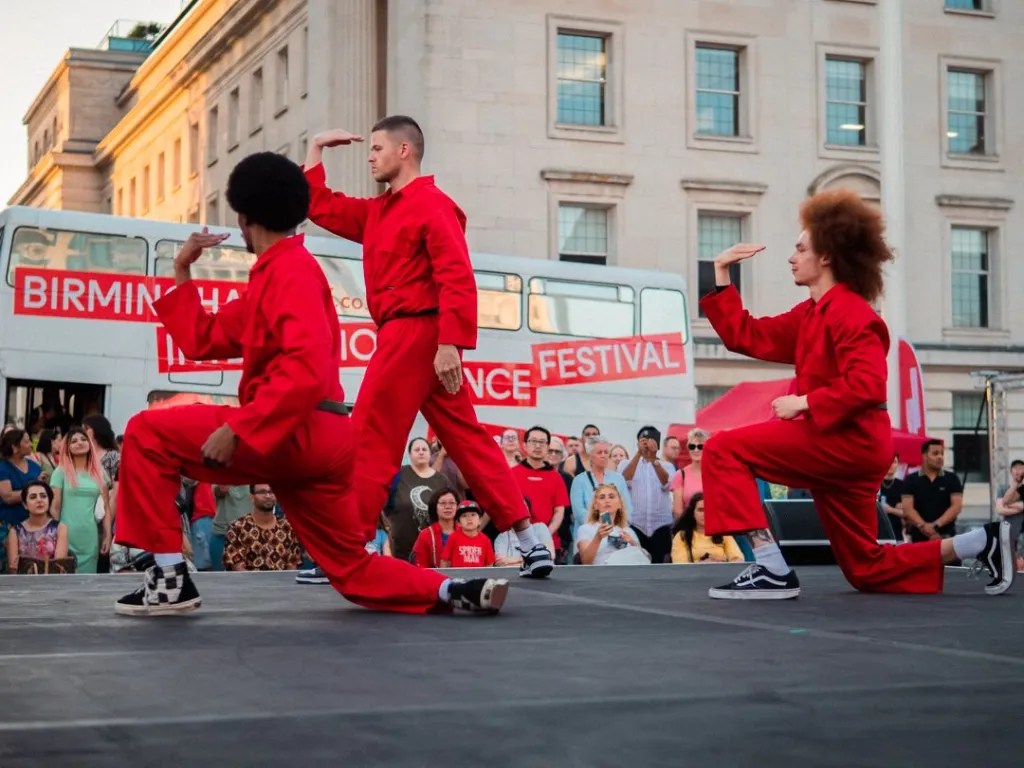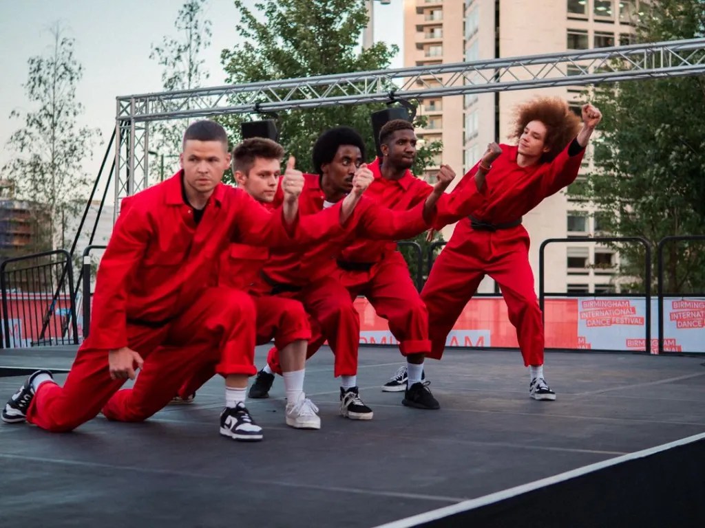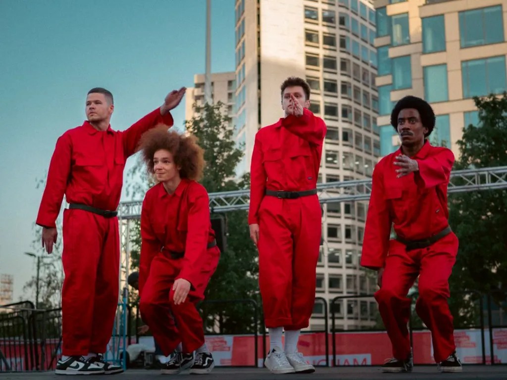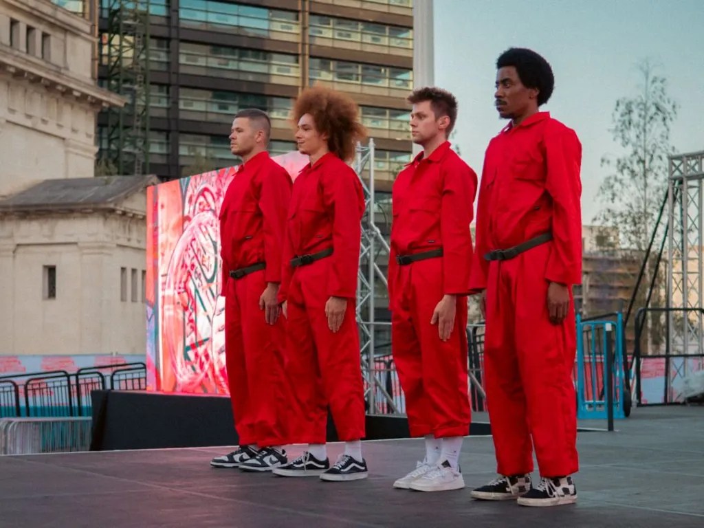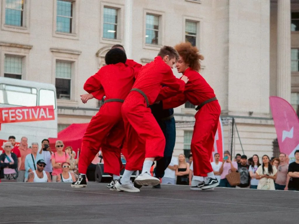 Dance moves aside the performers are visually striking in what they are wearing. All in red jumpsuits the uniformity of the dancers takes away their individuality. It highlights how they are not to be seen as people with stories and personalities, but as gears in a machine. As a means to creating a product that can generate revenue. The stylistic choice of the jumpsuits cleverly and clearly emphasises how they are homogenised, only to be recognised for their work. At the beginning of the piece one of the dancers (Warren Murray) is to one side on his own. He looks lost and his movements are static, robotic and disjointed. This changes when he joins the other workers/dancers. They move together as if they are one body. Fluid with a sense of unity between them. Each movement is effortless and graceful, yet simultaneously purposeful and meticulous. If you aren’t working are you really valuable in society? Are you really contributing? Team work makes the dream work after all. In a society where capitalism has become a factory of sorts. Where wage workers have become exploited. Where you’ll work for £9.50 an hour when food costs have risen by 10%. But you part of a team, so it’s worth it right? In sections of the performance one worker sits/breaks down whilst another reboots him. This could be a commentary on burn out and how work is often prioritised over health and wellbeing.