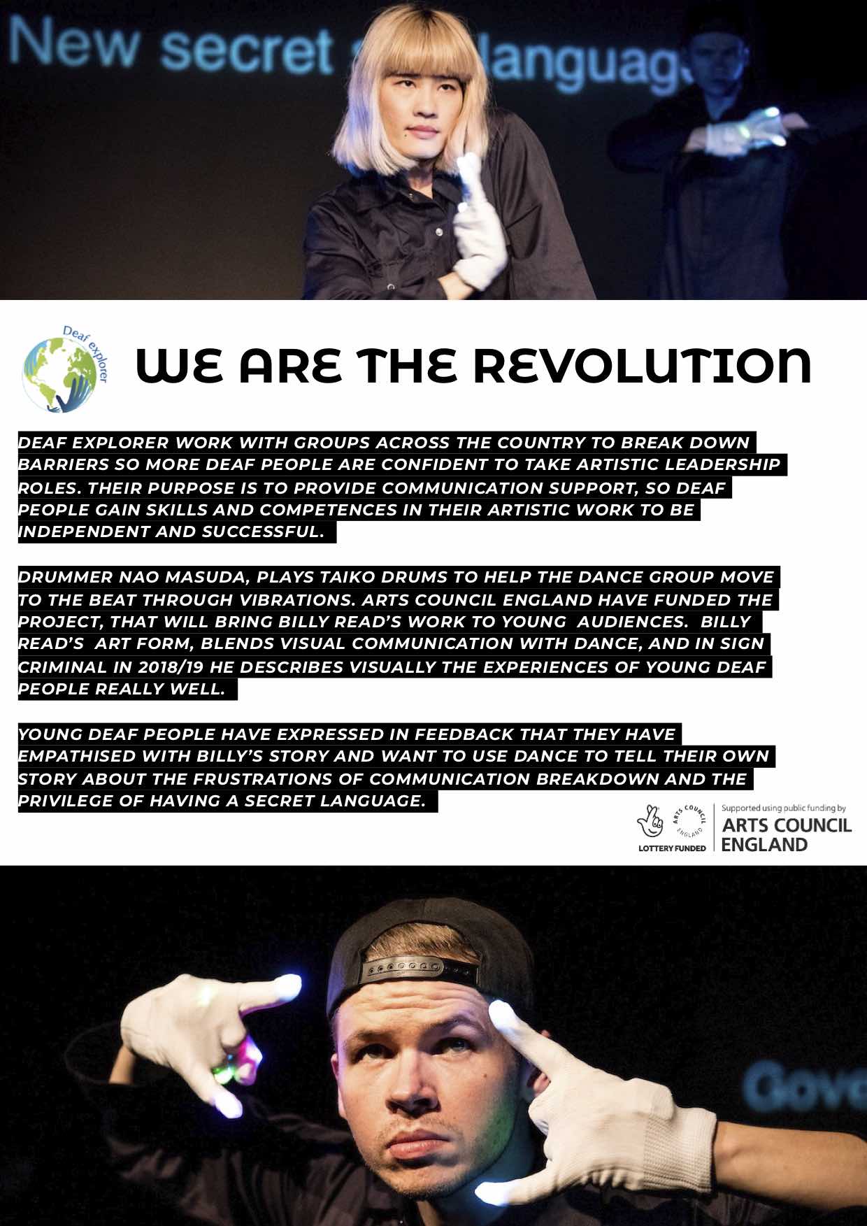 That will be followed by a totally unique performance by Deaf Explorer dance artist Billy Read of “We are the Revolution” based on a series of workshops, in collaboration with Deborah Pugh, a Movement artist.